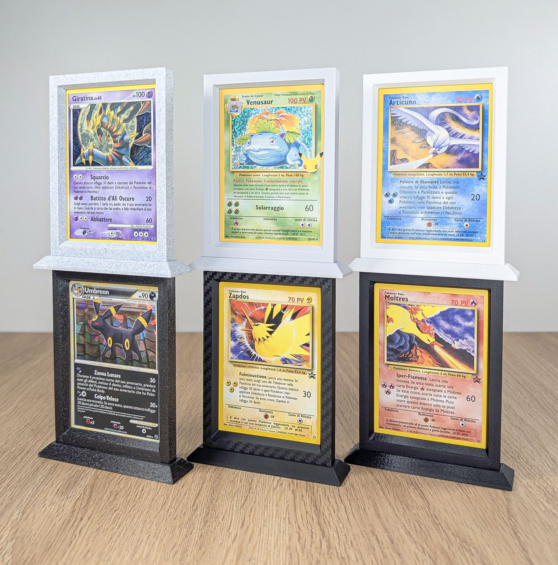 Realizzate con la stampa 3D, questi espositori sono la soluzione perfetta per mostrare le tue carte più preziose. Progettati su misura per custodire le carte all'interno delle loro pellicole protettive, assicura che i tuoi pezzi da collezione siano sempre al sicuro e in bella mostra.