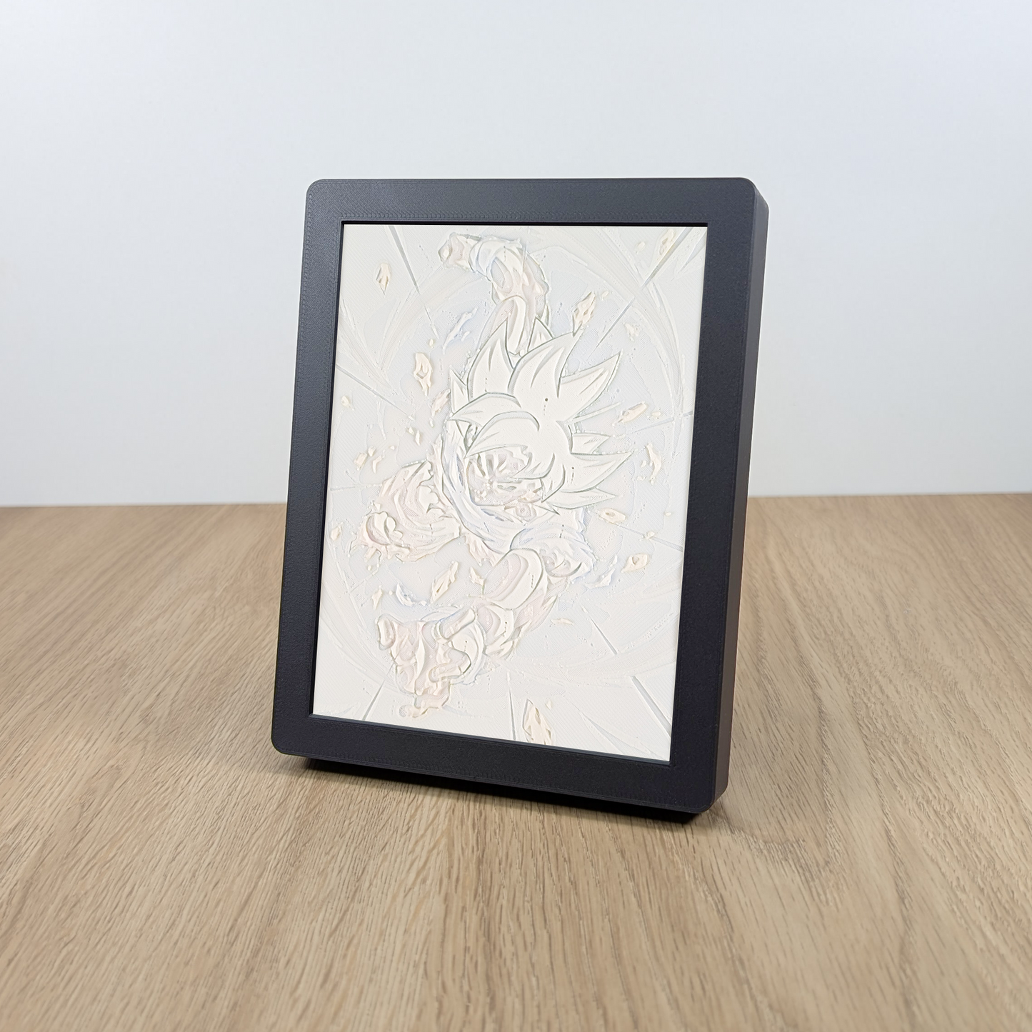 È completo di un quadro stampato anch'esso in 3D, che funge da supporto elegante e stabile, e include un pannello LED pronto all'uso. Basta collegarlo al cavo USB in dotazione e accenderlo tramite il pratico interruttore per ammirare ogni dettaglio che emerge con la luce.
