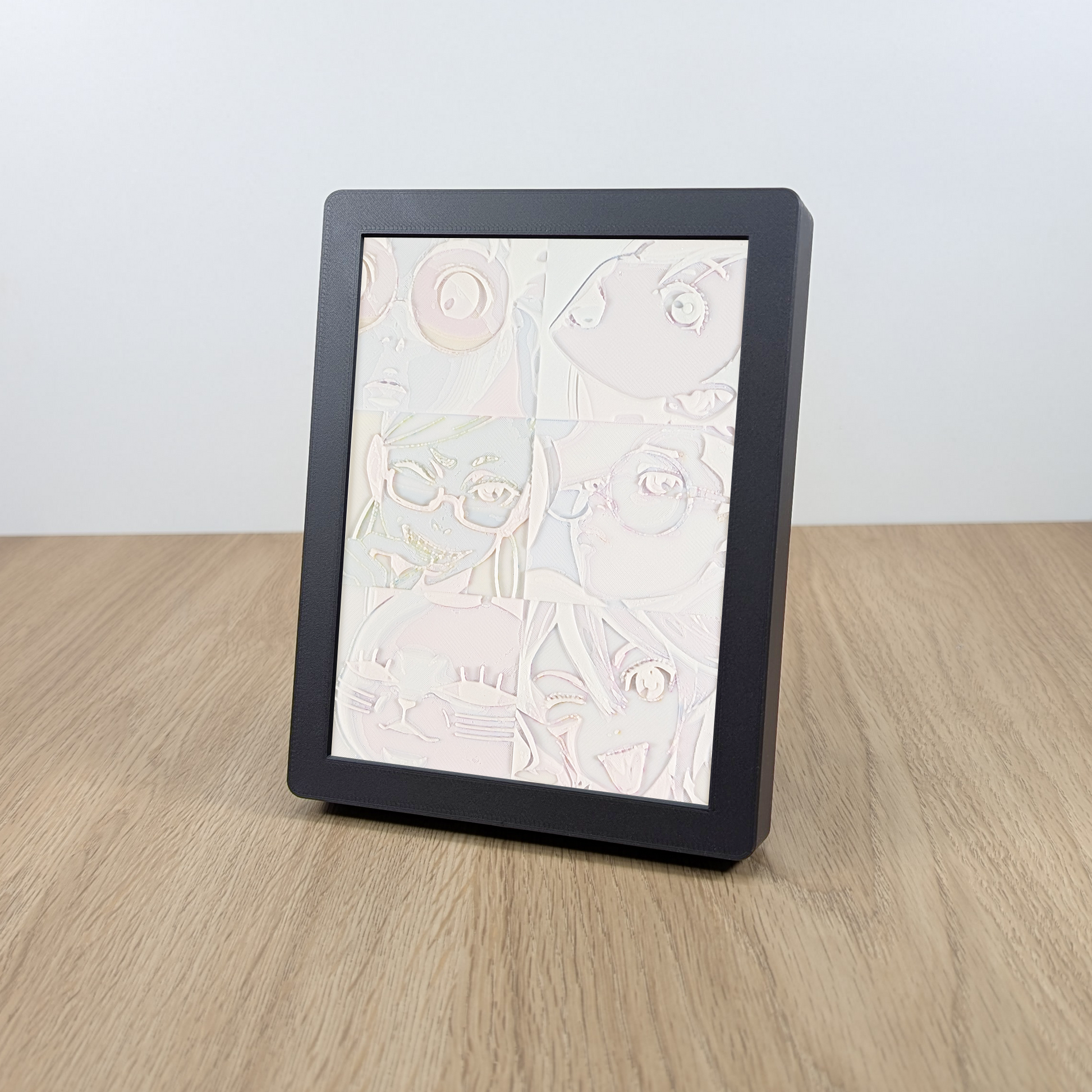 È completo di un quadro stampato anch'esso in 3D, che funge da supporto elegante e stabile, e include un pannello LED pronto all'uso. Basta collegarlo al cavo USB in dotazione e accenderlo tramite il pratico interruttore per ammirare ogni dettaglio che emerge con la luce.