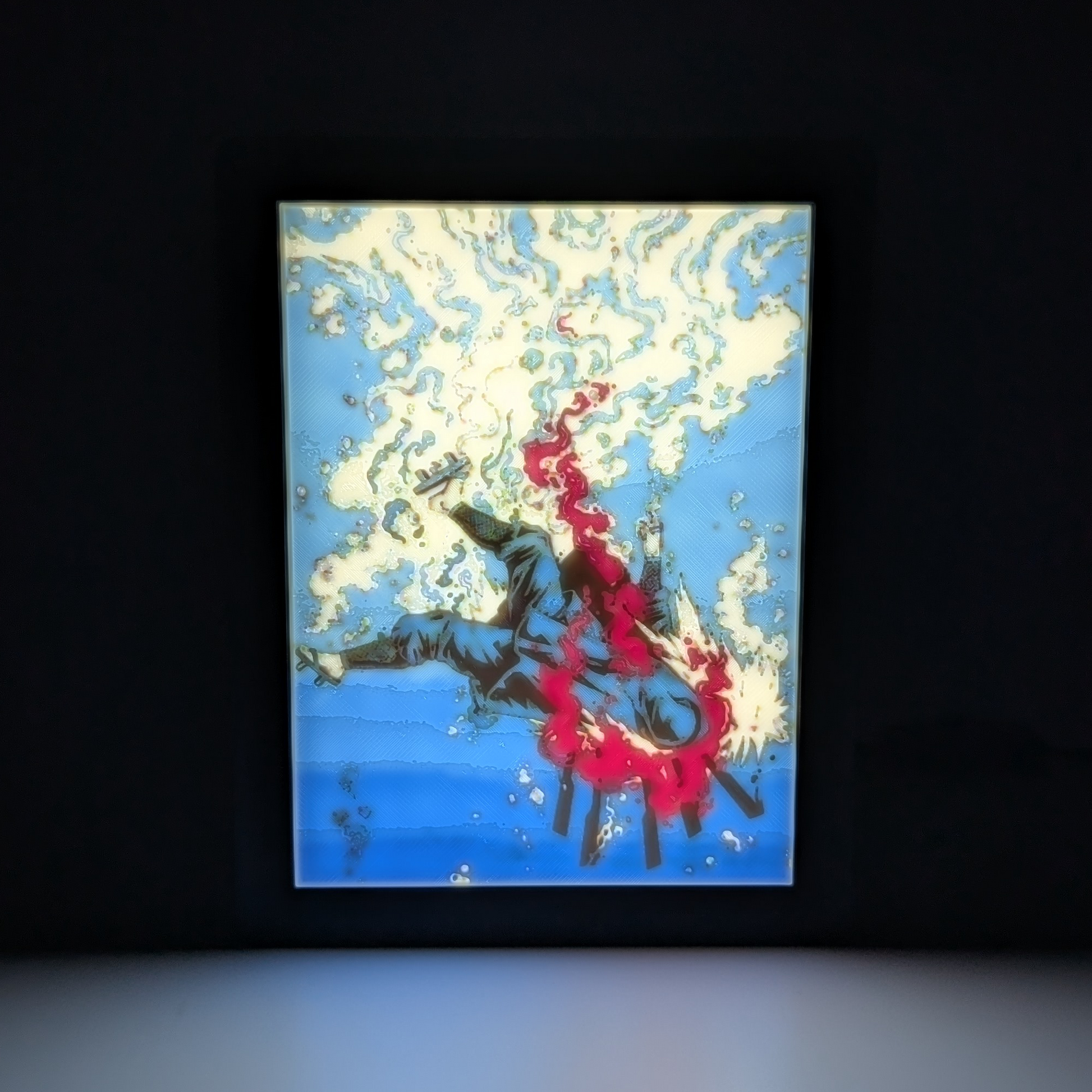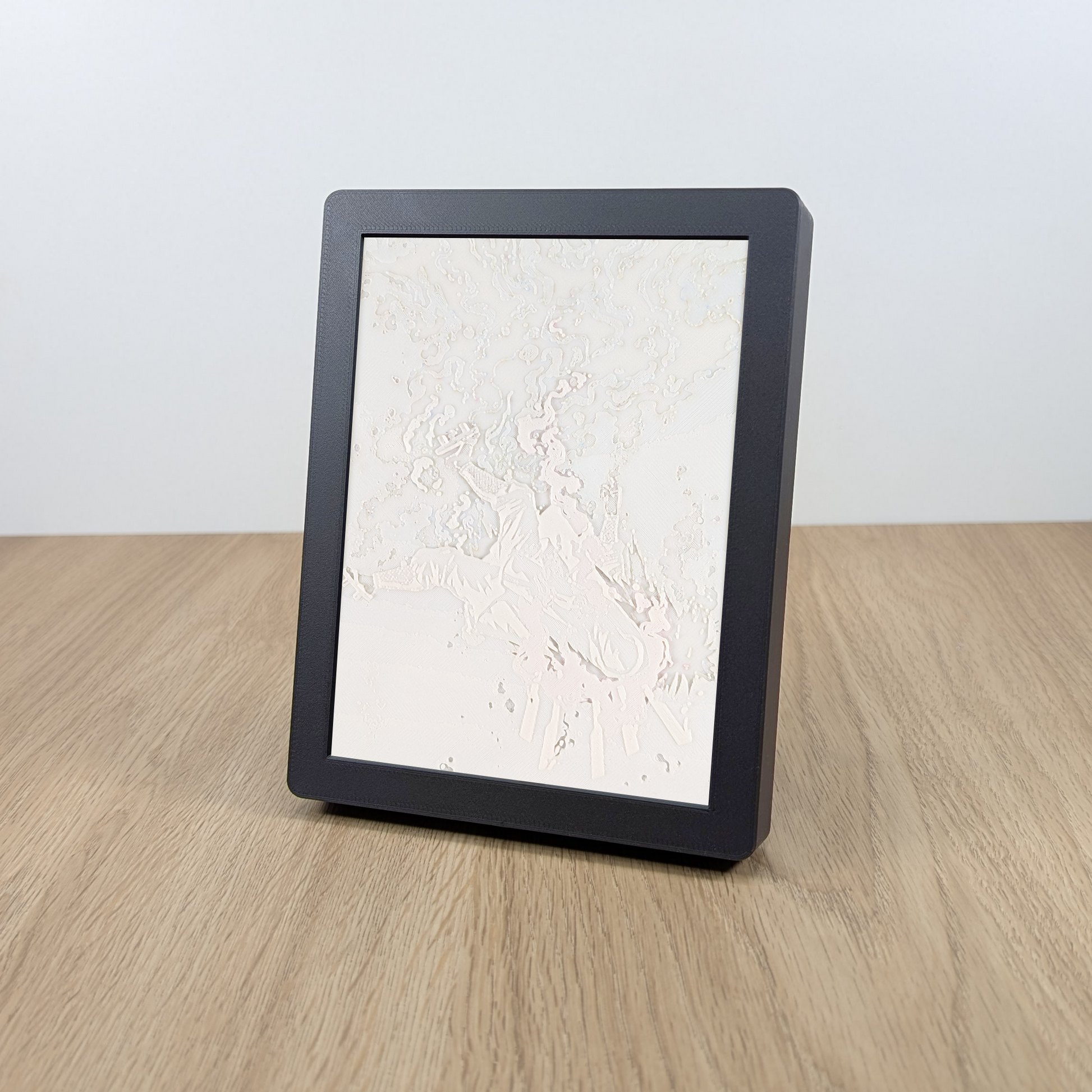 È completo di un quadro stampato anch'esso in 3D, che funge da supporto elegante e stabile, e include un pannello LED pronto all'uso. Basta collegarlo al cavo USB in dotazione e accenderlo tramite il pratico interruttore per ammirare ogni dettaglio che emerge con la luce.