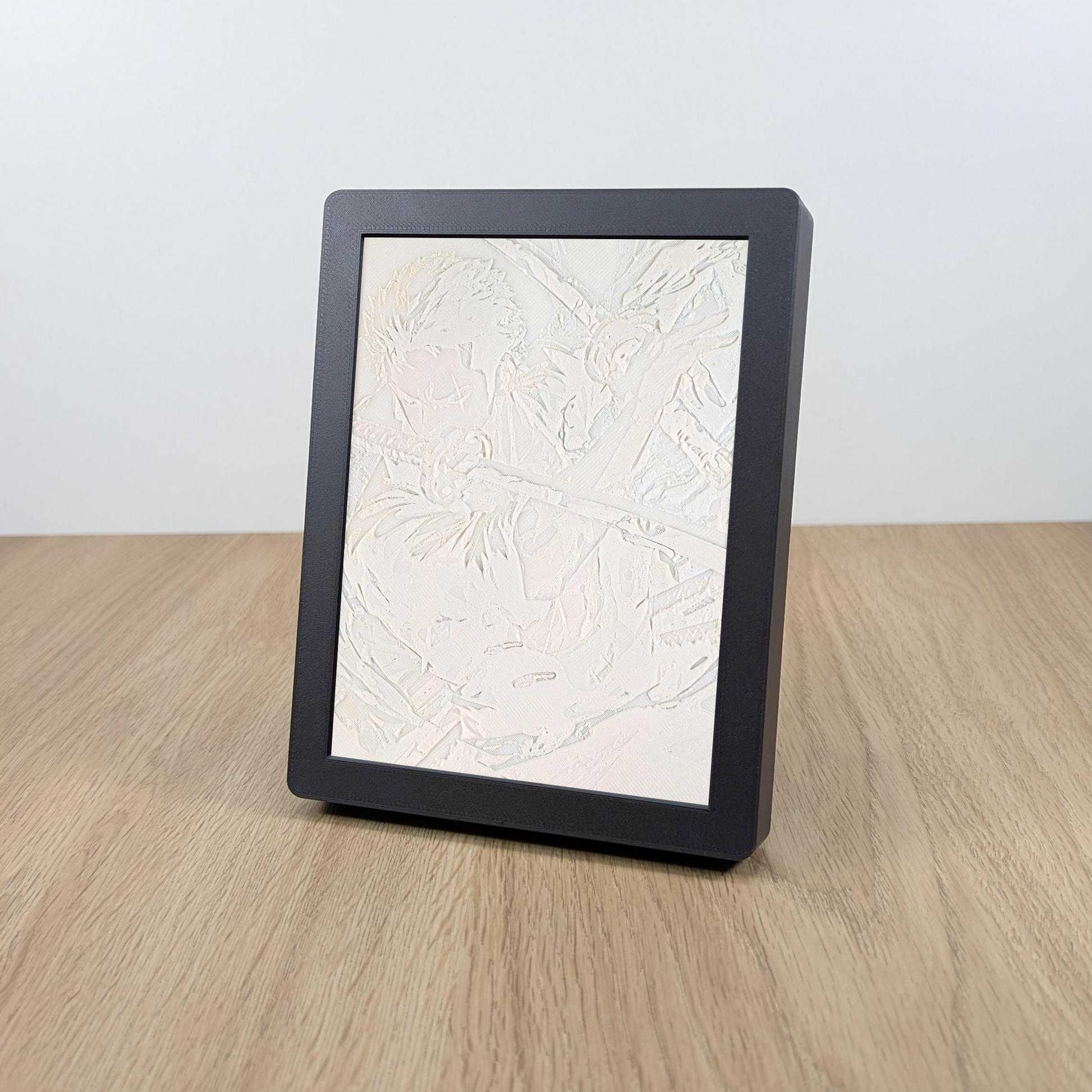 È completo di un quadro stampato anch'esso in 3D, che funge da supporto elegante e stabile, e include un pannello LED pronto all'uso. Basta collegarlo al cavo USB in dotazione e accenderlo tramite il pratico interruttore per ammirare ogni dettaglio che emerge con la luce.