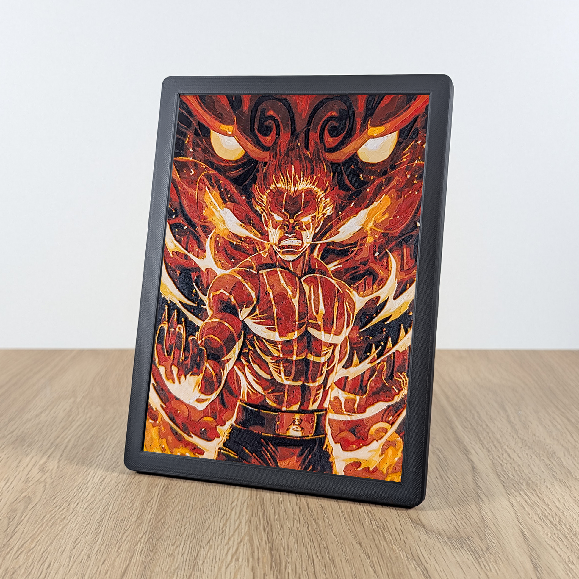 Ideale per gli amanti degli anime, è perfetto come regalo o come decorazione per scrivania, mensola o comodino, grazie alla cornice stampata in 3D nei toni bianco e nero, esponibile con il piedino removibile incluso o appendibile tramite i fori predisposti sul retro.