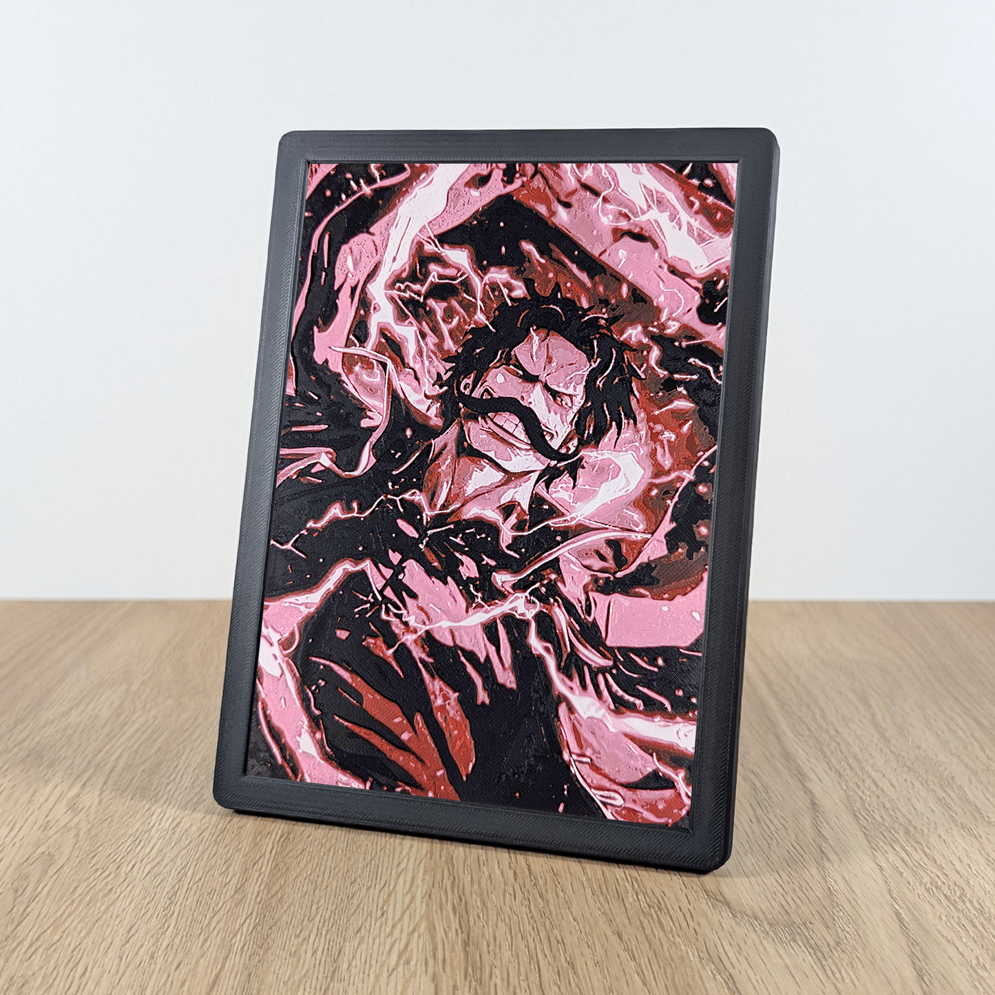 Ideale per gli amanti degli anime, è perfetto come regalo o come decorazione per scrivania, mensola o comodino, grazie alla cornice stampata in 3D nei toni bianco e nero, esponibile con il piedino removibile incluso o appendibile tramite i fori predisposti sul retro.